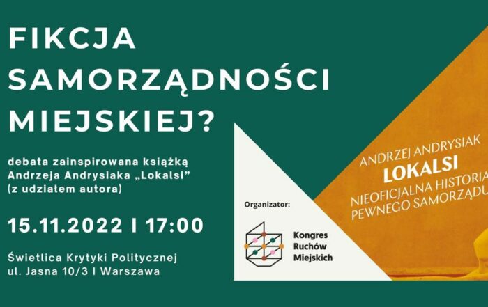 Zapraszamy na debatę pn. "Fikcja samorządności miejskiej?". Inspiracją dla debaty jest książka Andrzeja Andrysiaka „Lokalsi”. Organizatorem debaty jest KRM, w dyskusji udział wezmą: - Andrzej Andrysiak - dziennikarz, autor “Lokalsów”, - Edwin Bendyk - Prezes [...]